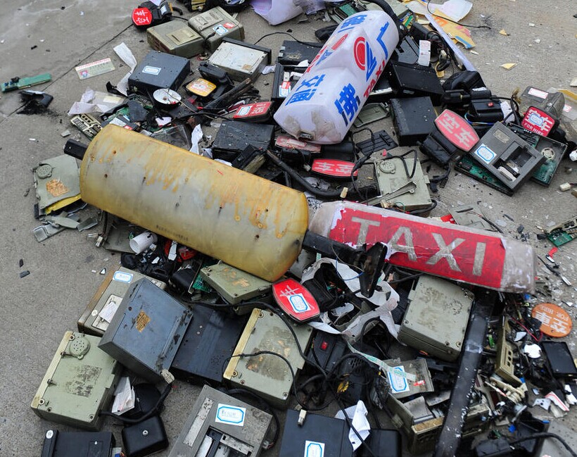12月24日,广东省佛山市,佛山市公安局、市交通运输局在张槎一路的一个车辆保管场,联合举行销毁假冒出租车暨非法营运出租车标识销毁仪式。据统计,今年以来,佛山市共查缴假冒出租车101辆,当日集中销毁了其中的35辆。图为现场一出租车司机正用力砸烂一辆仿真度很高的违法出租车。
