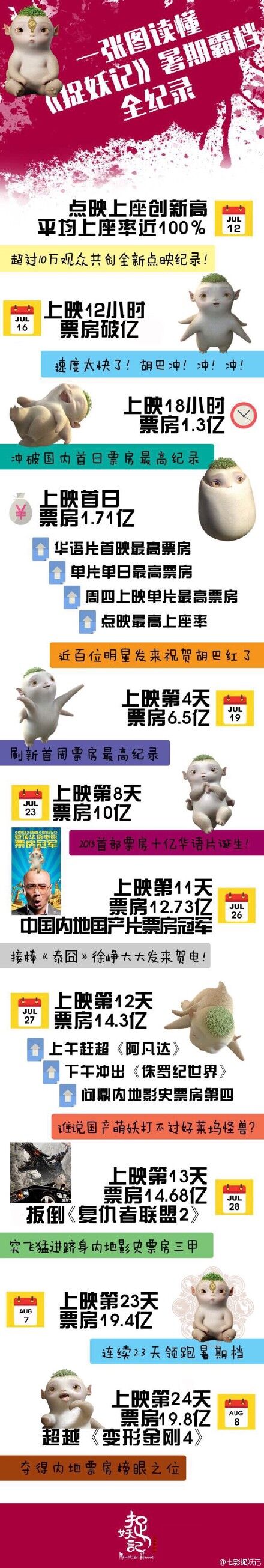 其实早在8月8日,《捉妖记》的票房就已经突破20亿大关,将《变形金刚4》的19.8亿甩在身后,成为中国影史上第二部20亿量级的影片。