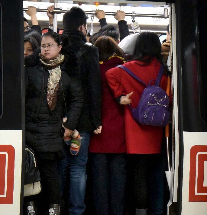 1月4日,郑州地铁1号线的一个车厢内挤满了乘客。当日是2015年元旦假期后的首个工作日。在郑州市地铁1号线的各个站台上,很多市民等待乘车上班,售票点前排起了长队,车厢里更是人头攒动。人们“收拾”好放假的轻松心情,投入到新的一年忙碌的工作中。