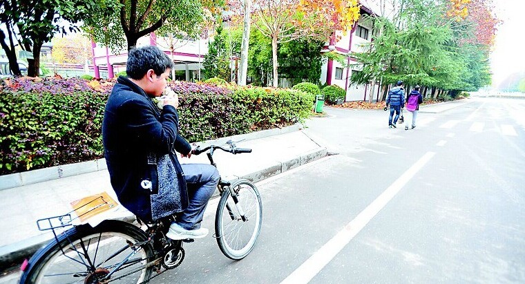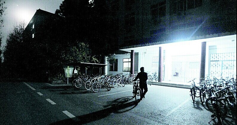 一名大三学生,每周最多时打6份工,换来每月1625元的收入,自己啃馒头,却资助了41名贫困学生。他叫骆群曙,武汉生物工程学院机电工程系学生,人们亲昵地称他“爱心小胖”。连日来,记者跟拍骆群曙,记录他平凡生活中的真实瞬间,追寻一名90后大学生的精神世界。图为:月亮还挂在天上,小骆推车出了宿舍楼。