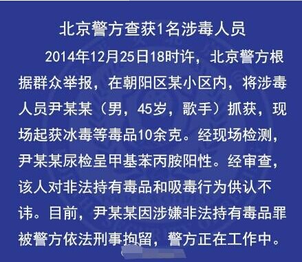2014年12月25日18时许,北京警方根据群众举报,在朝阳区某小区内将涉毒人员尹某某(男,45岁,歌手)抓获。现场起获冰毒等毒品10余克。经现场检测,尹某某尿检呈甲基苯丙胺阳性。经审查,该人对非法持有毒品和吸毒行为供认不讳。目前,尹某某因涉嫌非法持有毒品罪被警方刑事拘留。据北京晨报微博称,尹某某便是著名歌手尹相杰。目前案情仍在调查中。