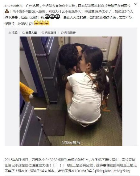 昨晚西部航空航班上有旅客在下降过程中带着小孩在座位通道大小便。今天ZH9709航班又有旅客带小孩在后舱大便,事发厕所没人用,旅客嫌厕所太小了,嫌3个人挤不进去,后面大宽敞!最让人无语的是,当妈的还跟孩子说,宝宝不急慢慢拉,还没起飞呢。