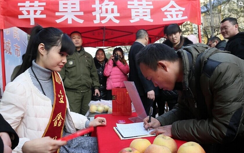 2014年12月23日,郑州二七路一珠宝广场,200多位市民排起了数十米长队,拿着苹果等待换黄金。据介绍,为了迎圣诞节,凡持一对苹果到金鑫珠宝正弘店,即可免费兑换迷你“招财金”小金条一个。