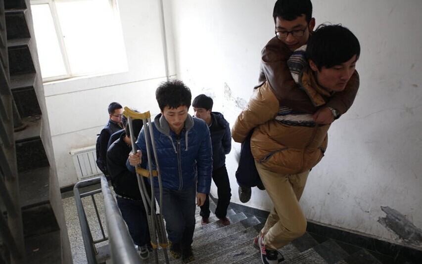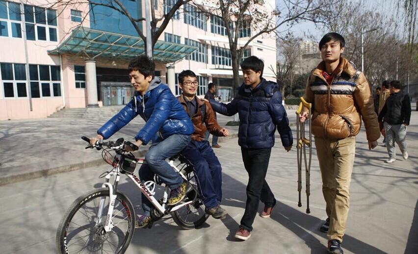 2014年12月23日消息,陕西咸阳,“病魔虽然夺去了我的健康,上天却赐予了我一群好舍友。”双腿残疾无法行走,生活对于咸阳师范学院大三学生田亚峰来说无疑是残酷的,但他又是幸运的,因为每当他要上楼下楼时,5个舍友的肩膀总会及时挺出,两年多来风雨无阻。图为中午,田亚峰的室友们带着他到食堂吃饭。